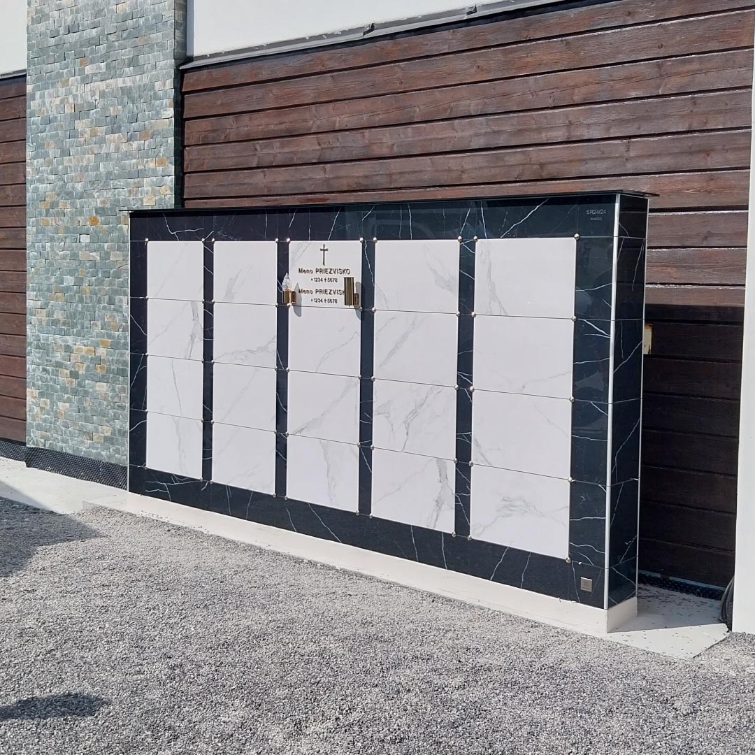 Nápisné dosky na urnových bunkách sú esteticky doplnené písmom Romano v povrchovej úprave – zlato, čo dodáva celému kolumbáriu dôstojný a vkusný vzhľad.